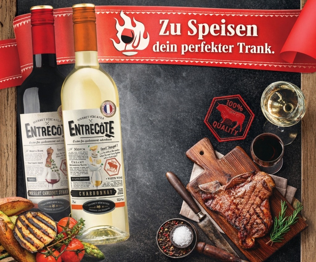 Die Nähe zu Frankreich und dessen Küche ist dabei kein Zufall: Entrecôte steht sinnbildlich für Genuss, Qualität und das Zusammenspiel von Wein und Speisen. Saftige Frucht, weiche Texturen und ein runder Charakter machen die Weine vielseitig einsetzbar - vom gemütlichen Abendessen bis zur geselligen Runde mit Freunden. Und ganz im Sinne der Marke gilt: Wo gutes Essen ist, darf guter Wein nicht fehlen. Entrecôte bringt beides zusammen - unkompliziert, ehrlich und mit einem klaren Bekenntnis zum Genuss.